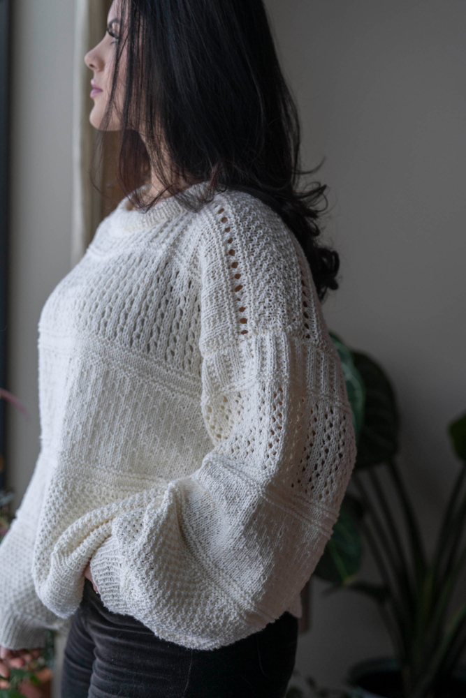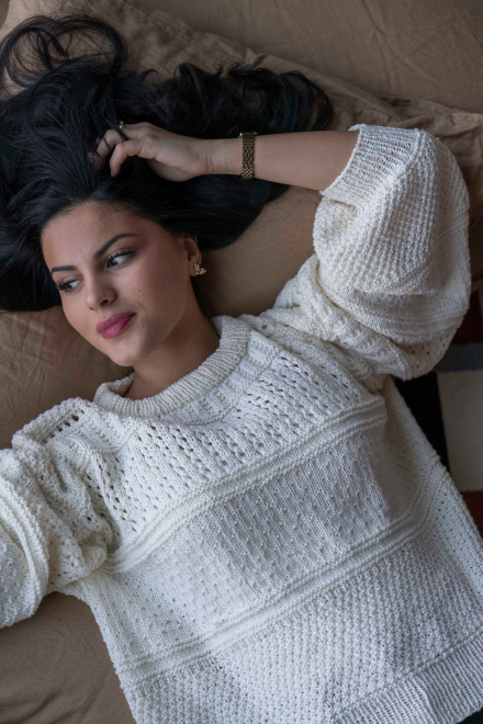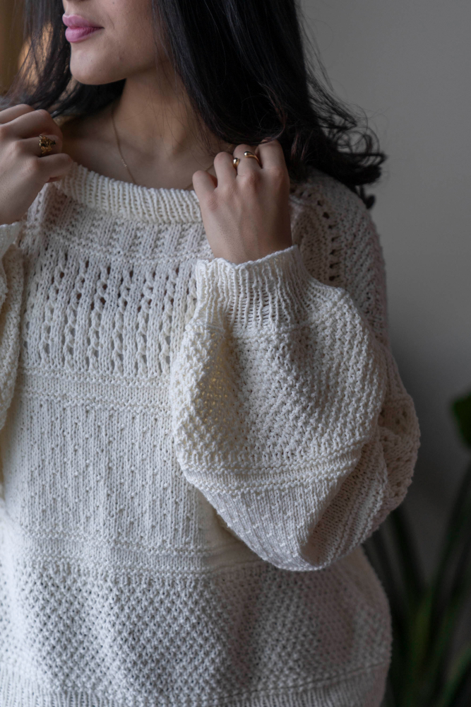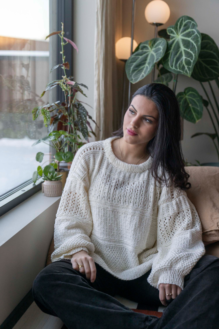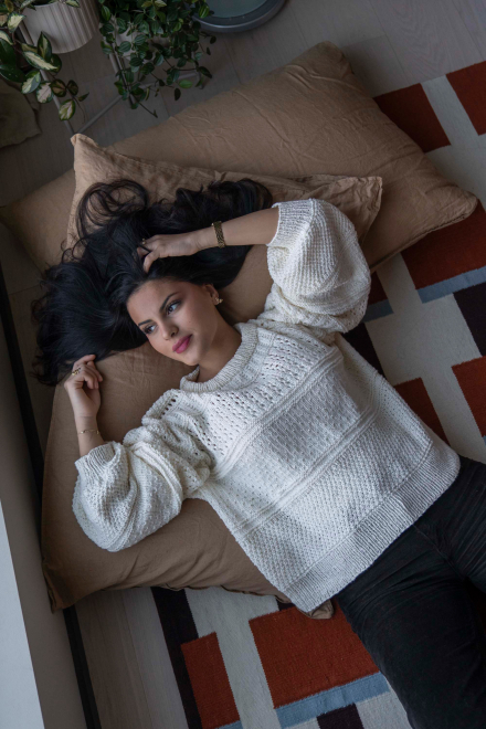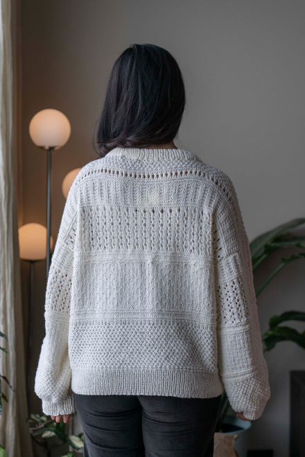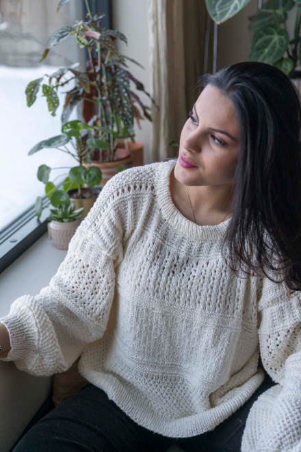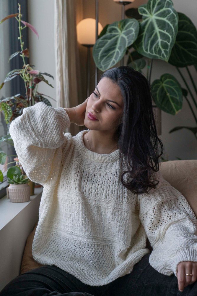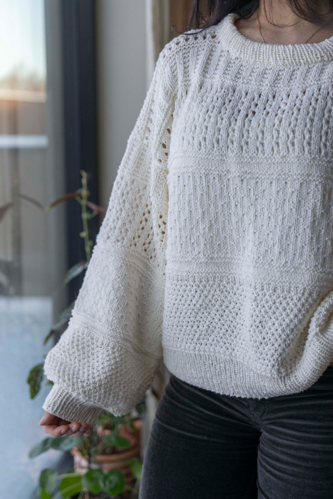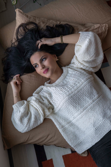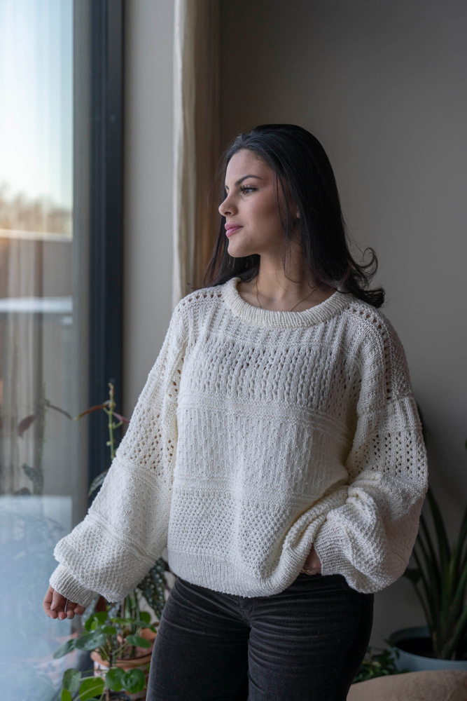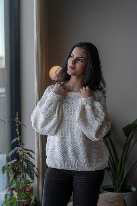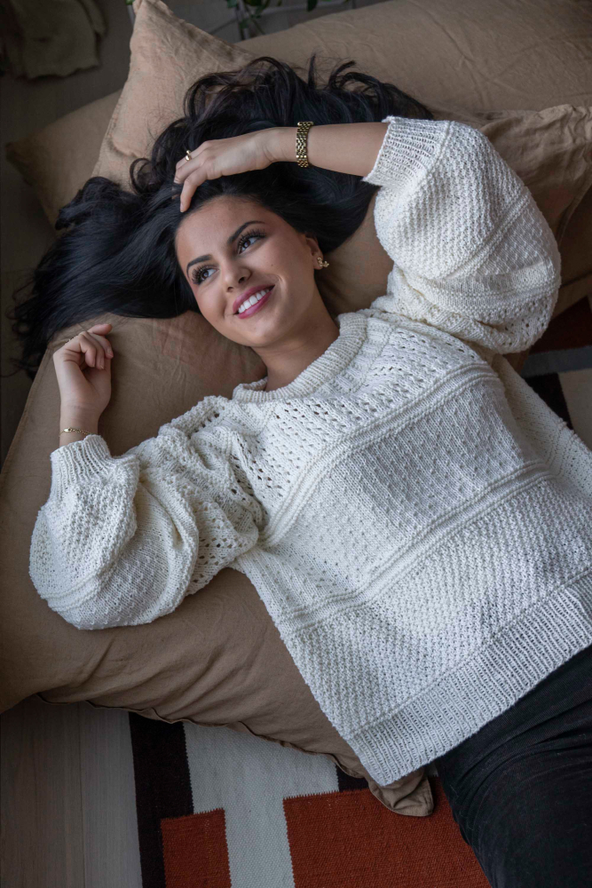 Rett, vrang, strukturmønster / Plagget strikkes rundt nedenfra og opp med isatte ermer som syes på for hånd / Vanskelighetsgrad; Middels