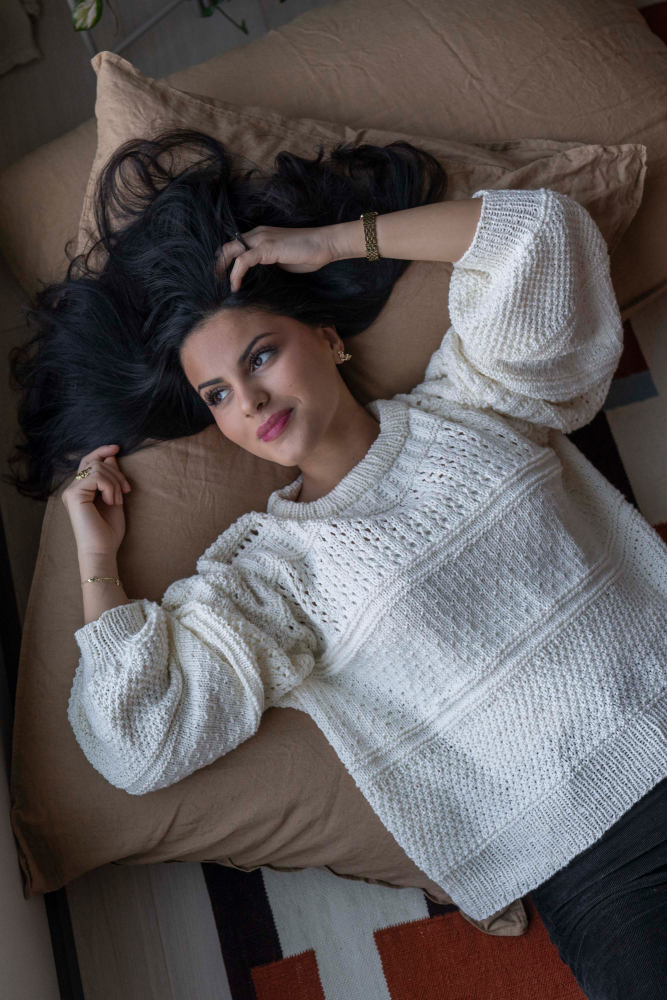 Slik finner du riktig størrelse : Ta mål av et plagg du allerede har, som passer. Sammenlign målene med oppskriften. Velg størrelse ut i fra overvidden på bolen . Lengde på både bol og ermer kan du selvsagt strikke lenger eller kortere ved behov, bare husk å bestill ekstra garn om du vil legge til noe på lengden!