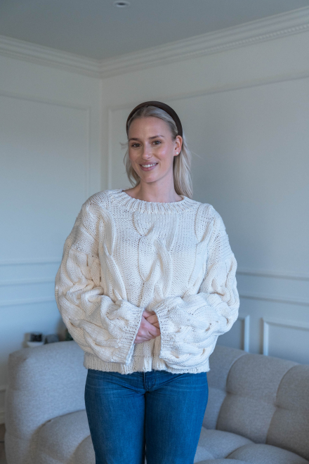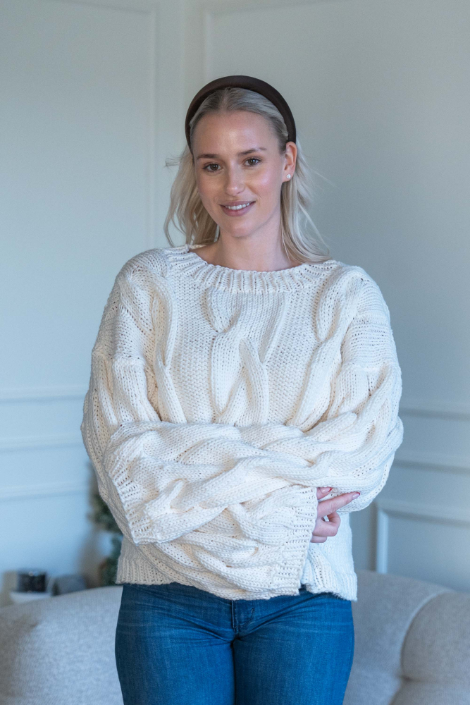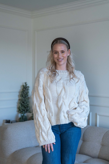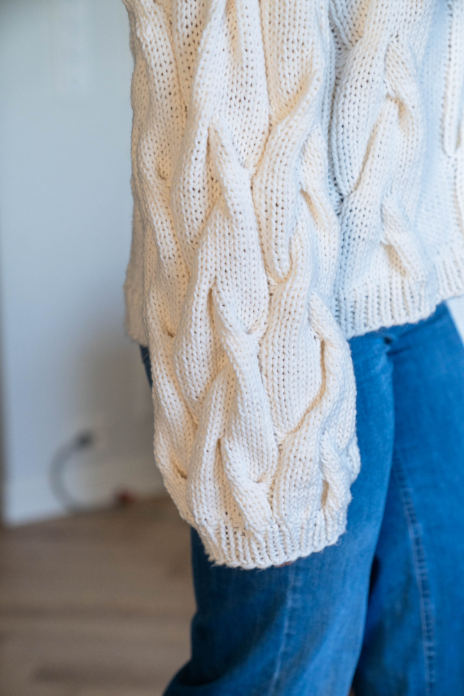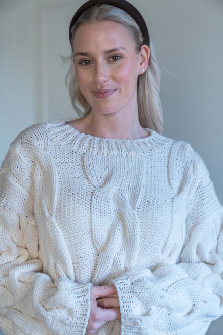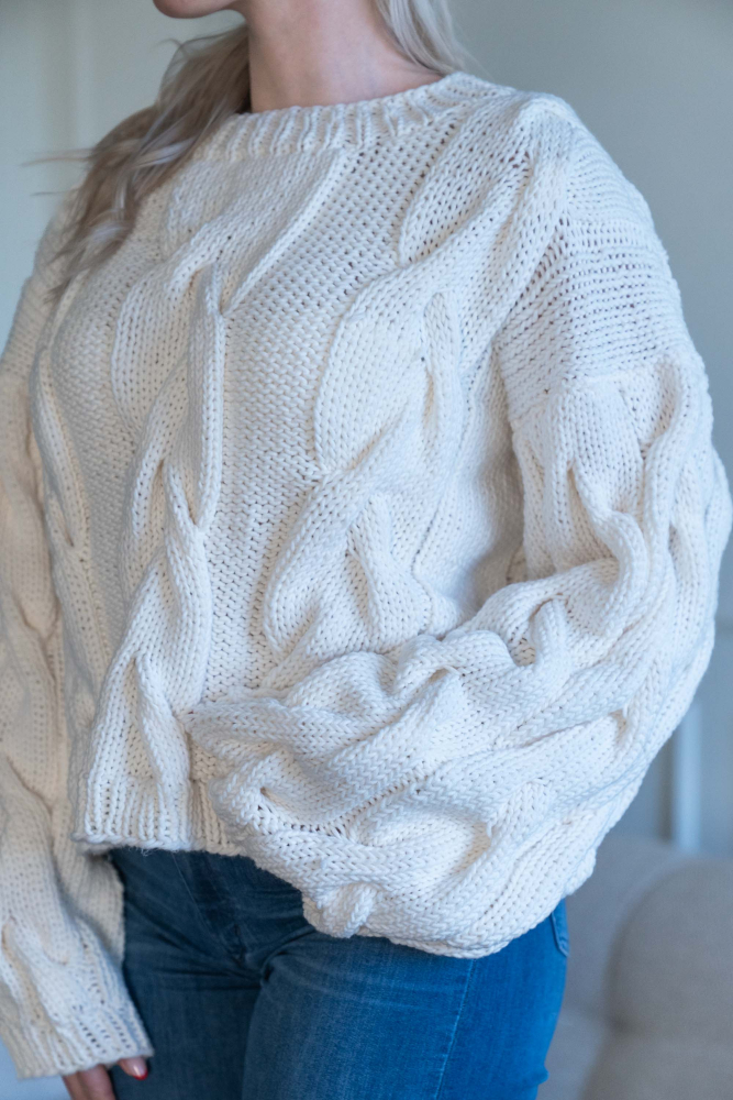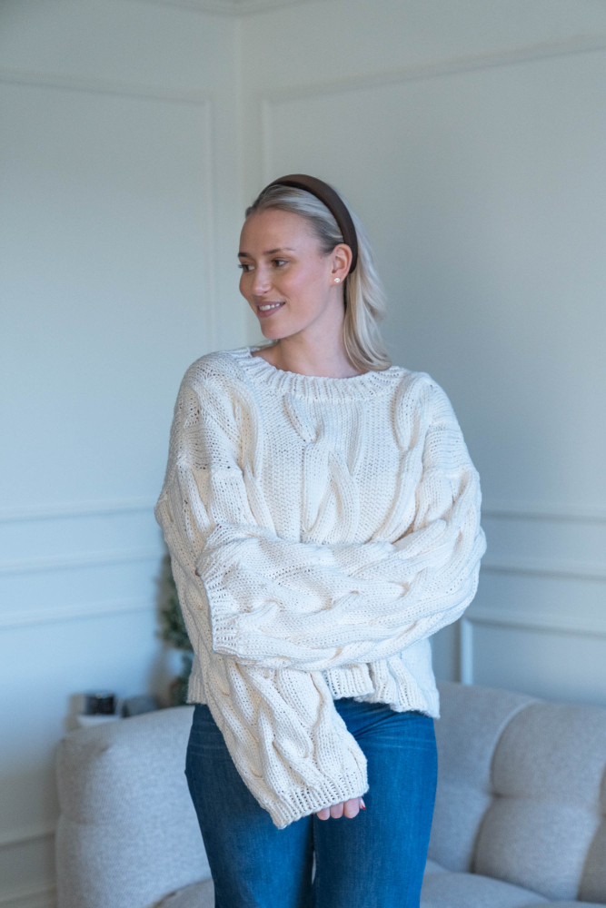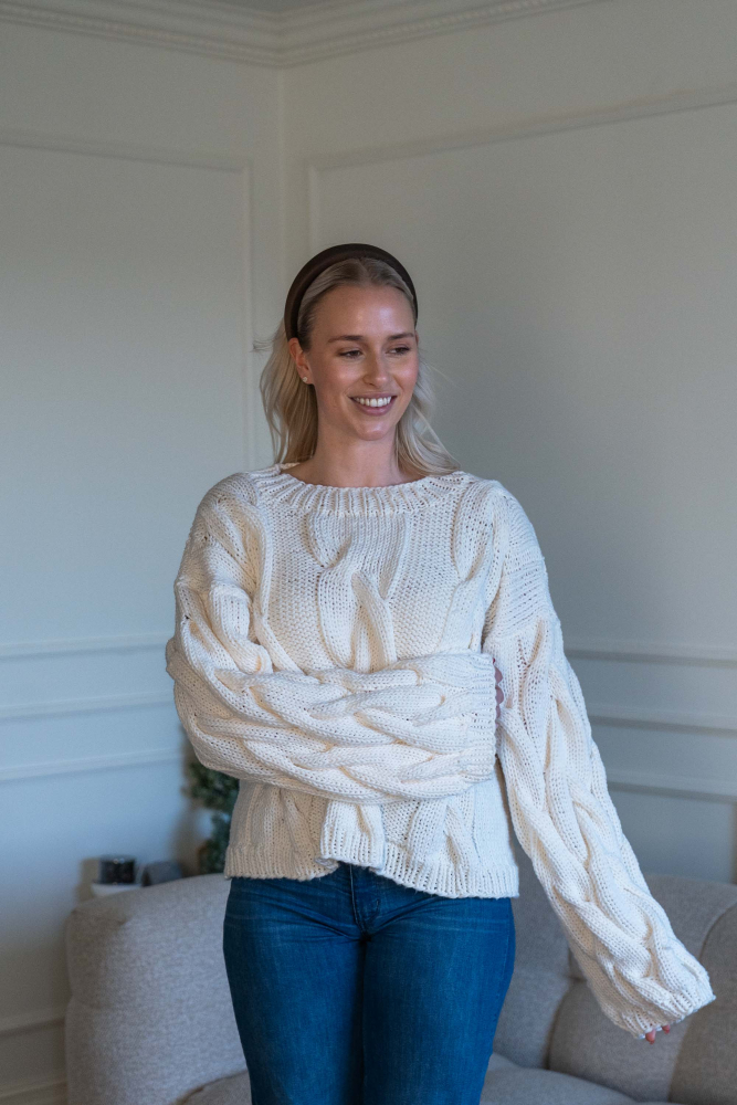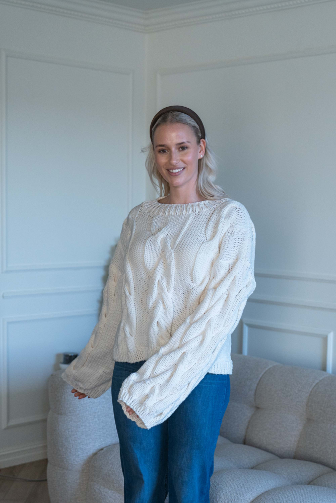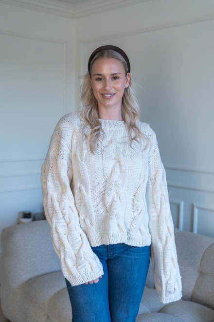 Kort oversized genser med fletter. Strikkes nedenfra og opp.