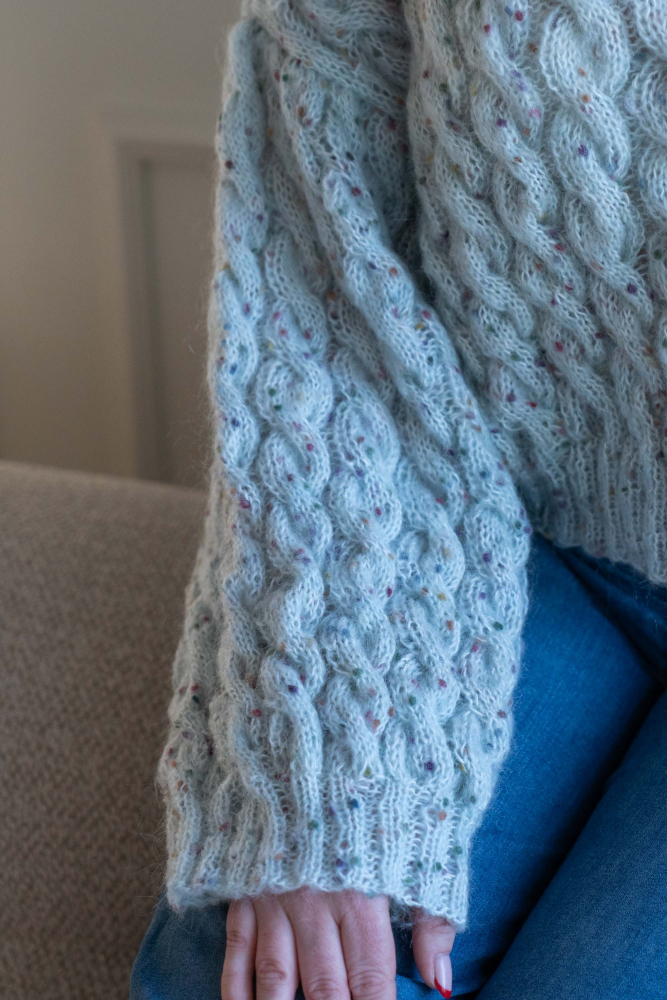 Glattstrikk, rett, vrang, flettestrikk. / Plagget strikkes rundt nedenfra og opp med isydde ermer / Vanskelighetsgrad; Øvet