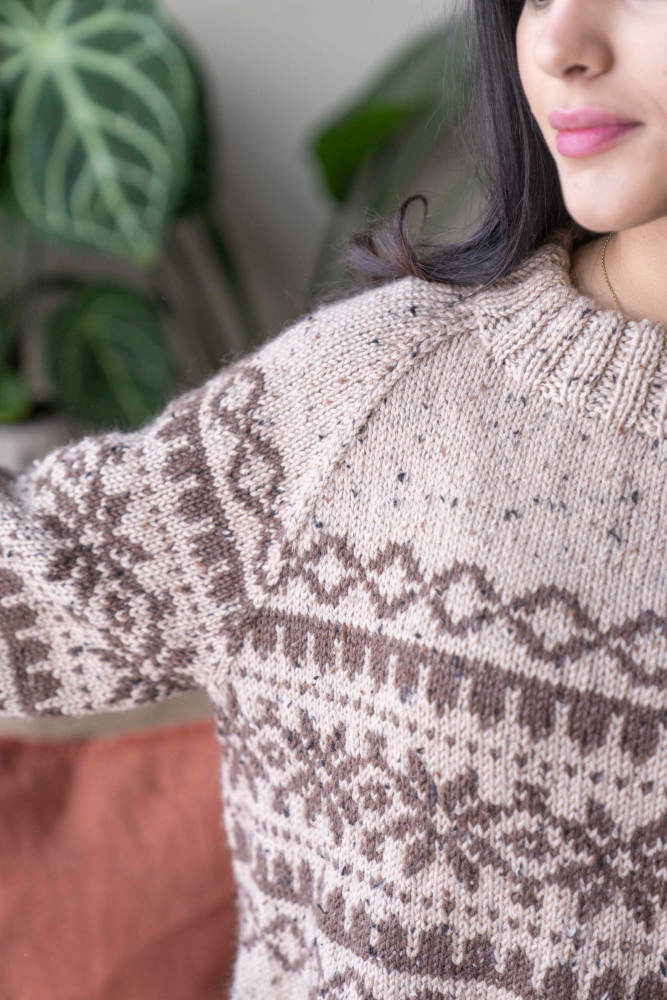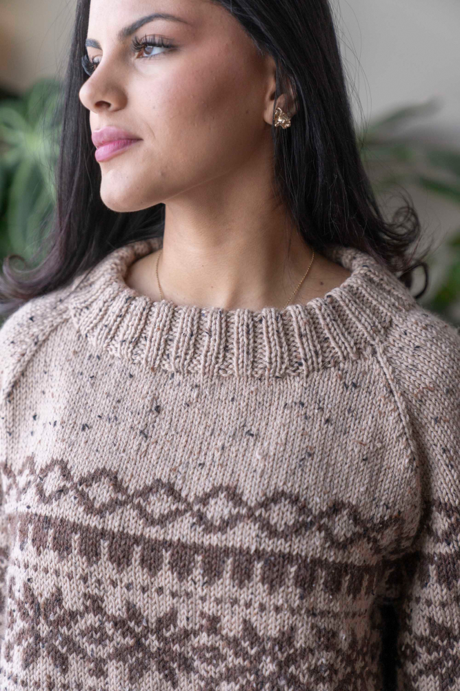 Glattstrikk, rett, vrang , mønster med flere farger. / Plagget strikkes rundt nedenfra og opp med raglan / Vanskelighetsgrad; Middels
