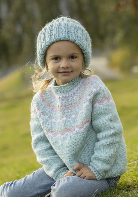 Du kan selv endre farge i strikkepakken ; velg da først størrelsen du ønsker å strikke, så kommer det opp fargevalg nedenfor. NB! Oppskrift vil alltid leveres i strikkepakkens originale farge