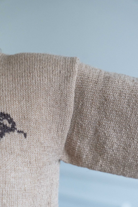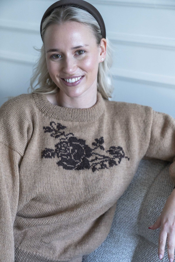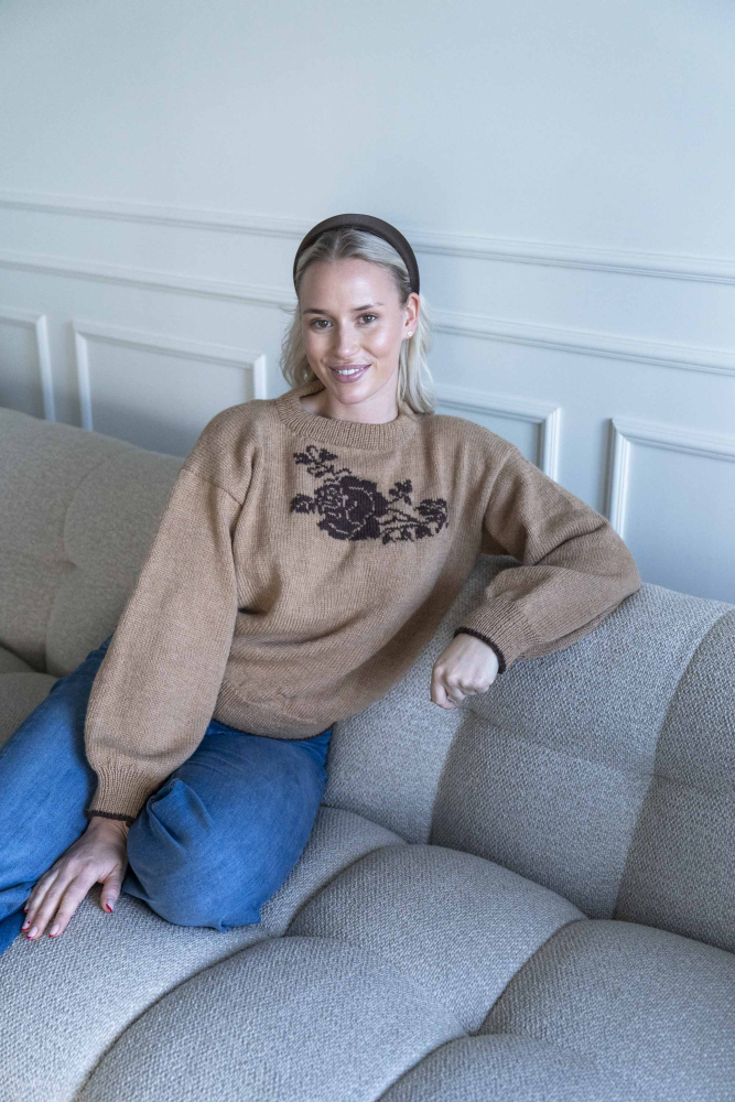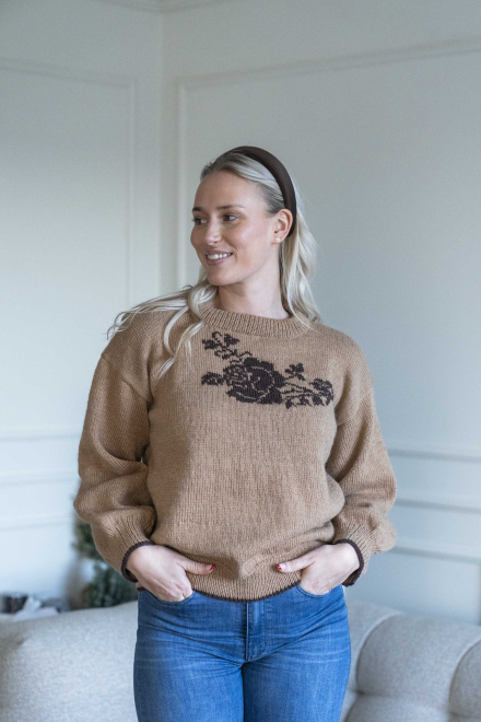 Enkel genser med motiv av rose foran som strikkes inn med intarsiastrikk eller sys på med maskesting til slutt.