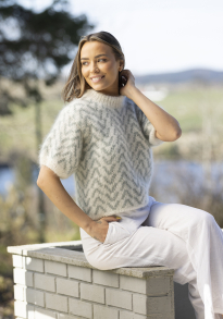 Garntyper brukt i oppskriften: Kid Silk (77% Kid Mohair, 23% silke), nøster à 25g og Alpaca Liten Storm (40% Alpakka Superfine, 40% Merino Ull, 20 % nylon fiber) nøster à 50g