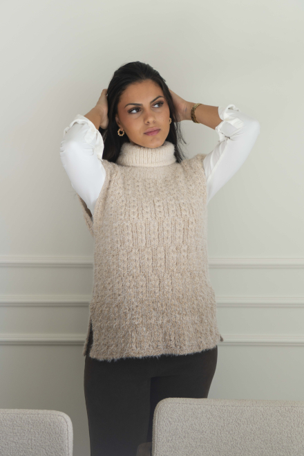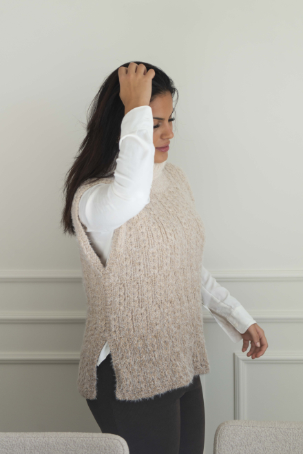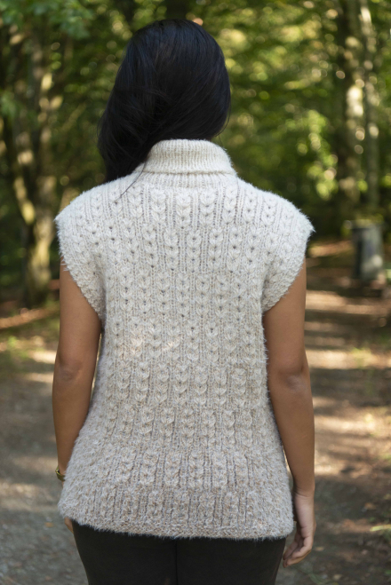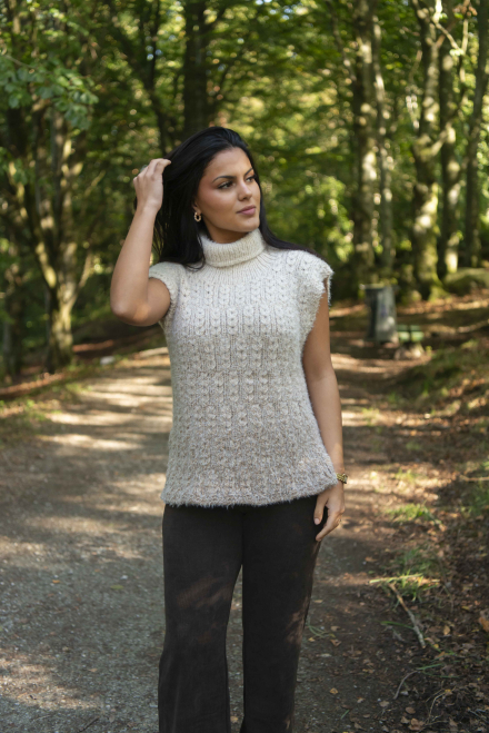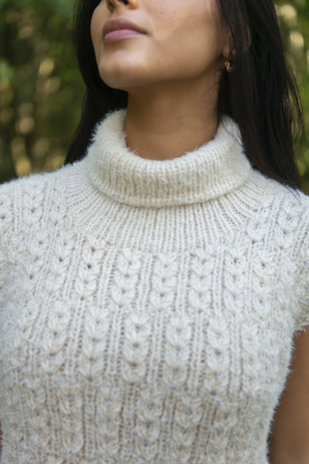 Glattstrikk, rett, vrang, hullmønster/struktur. /  Plagget strikkes rundt nedenfra og opp, og deles ved ermehullene for så å strikkes frem og tilbake. / Vanskelighetsgrad; Lett Øvet