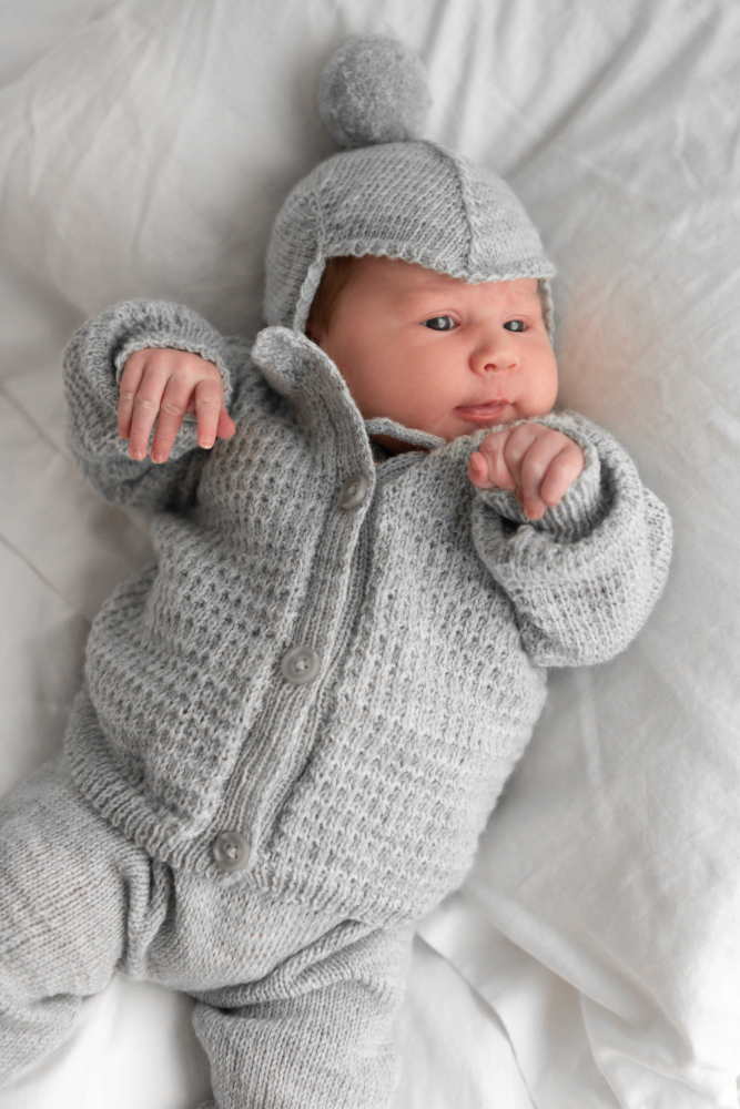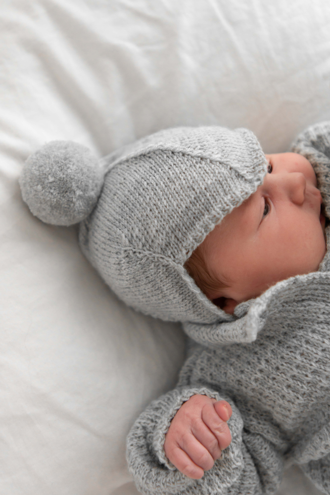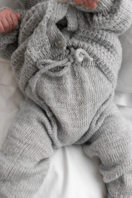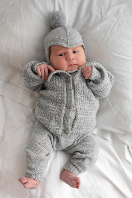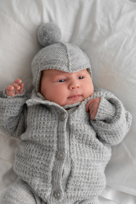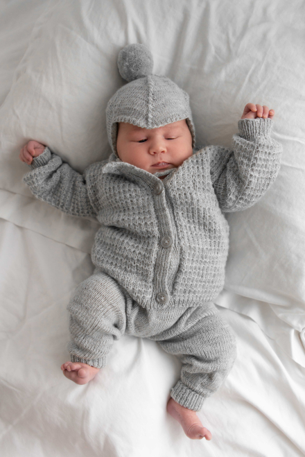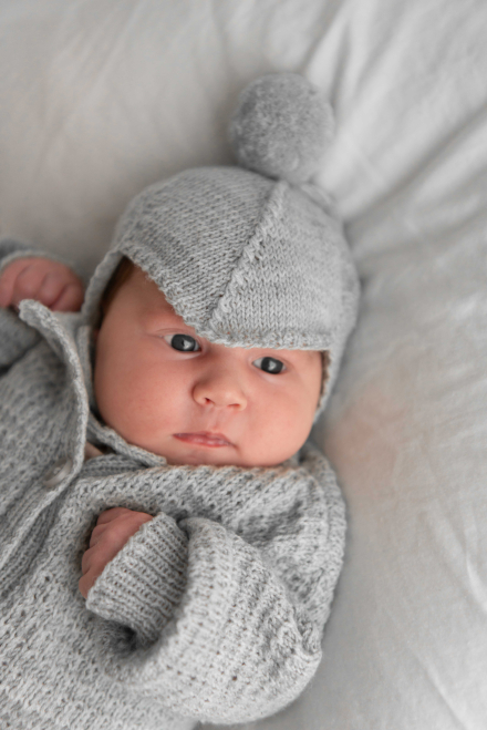 Jakke med strukturmønster, bukse og lue i glattstrikk.