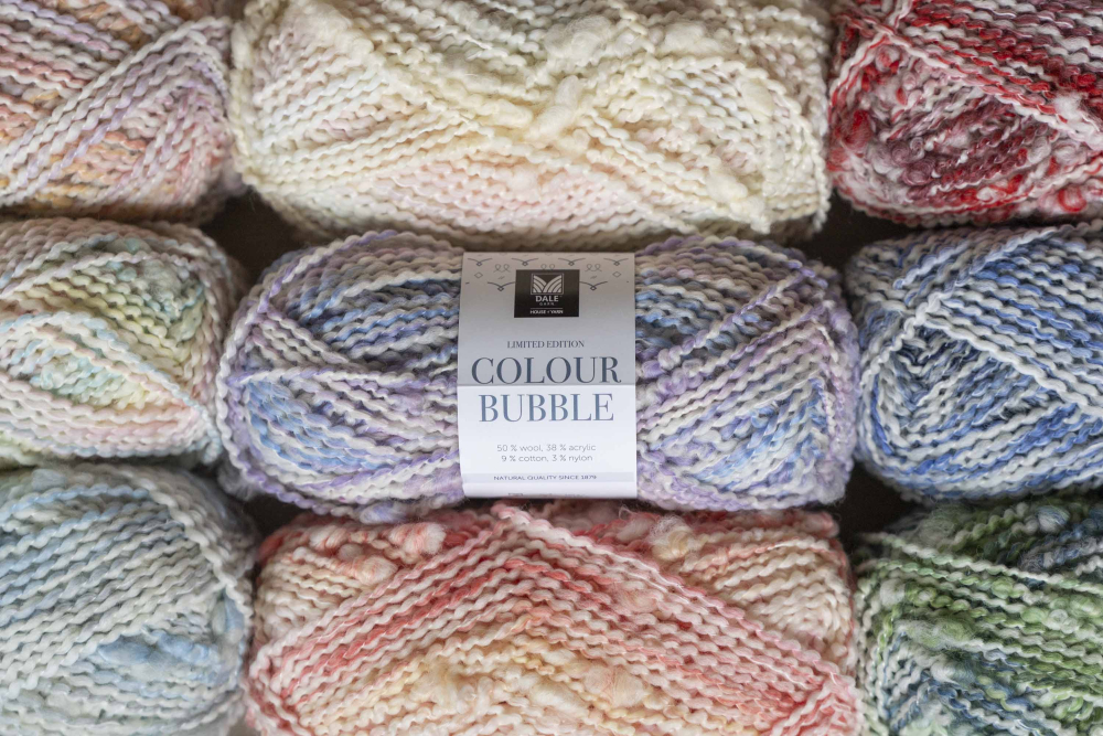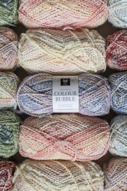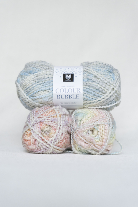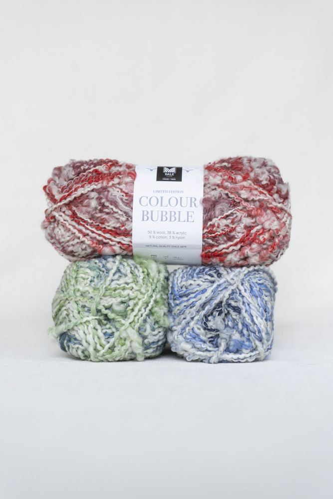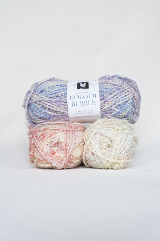 Colour Bubble er et effektgarn til strikking og hekling med selvstripende, lange fargeskift. En bølgende tråd me myke overganger mellom de forskjellige fargene på nøstene. Perfekt til alle typer plagg og tilbehør, samt kluter og interiør.