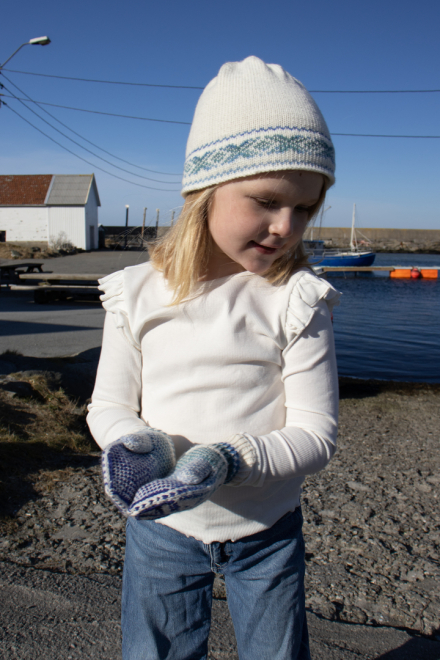 Du kan selv endre farge i strikkepakken ; velg da først størrelsen du ønsker å strikke, så kommer det opp fargevalg nedenfor. NB! Oppskrift vil alltid leveres i strikkepakkens originale farge: Natur og Blå Print