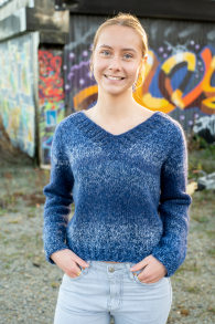 Rett. vrang. mønster med flere farger. Plagget strikkes rundt nedenfra og opp, og har rundfelling på bærestykket. Vanskelighetsgrad; Lett Øvet