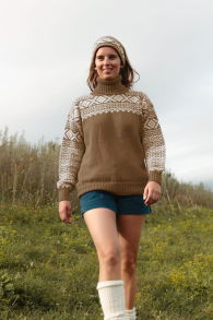 Du kan selv endre farge i strikkepakken ; velg da først størrelsen du ønsker å strikke, så kommer det opp fargevalg nedenfor. NB! Oppskrift vil alltid leveres i strikkepakkens originale farge: Nøttebrun, Natur, Safrangul og Brun
