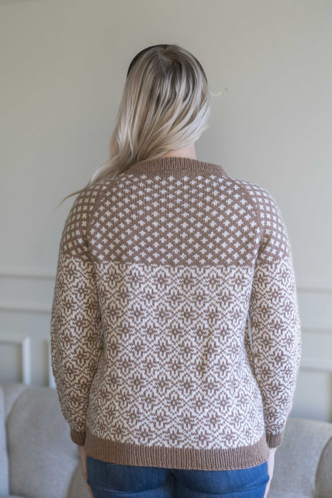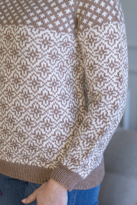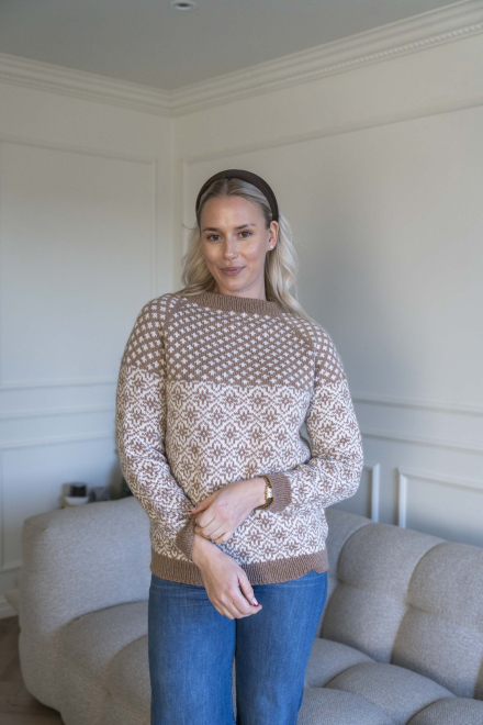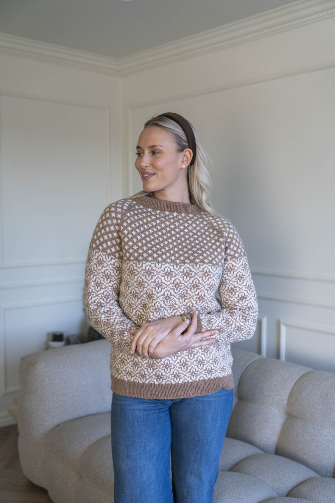 Du kan selv endre farge i strikkepakken ; velg da først størrelsen du ønsker å strikke, så kommer det opp fargevalg nedenfor. NB! Oppskrift vil alltid leveres i strikkepakkens originale farger: Hvit og Mocca Mousse