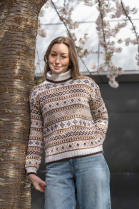 Fenna er en nydelig , rundstrikket genser med tradisjonspreget mønster på bærestykket. Denne finner du også til barn og til herre, så her kan hele familien få like !
