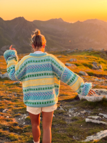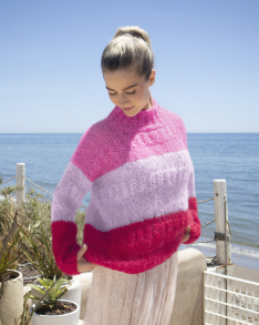 Du kan selv endre farge i strikkepakken ; velg da først størrelsen du ønsker å strikke, så kommer det opp fargevalg nedenfor. NB! Oppskrift vil alltid leveres i strikkepakkens originale farge: Lys Lavendel og Regnbue Print