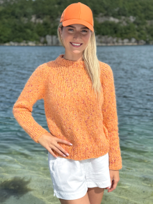 Du kan selv endre farge i strikkepakken ; velg da først størrelsen du ønsker å strikke, så kommer det opp fargevalg nedenfor. NB! Oppskrift vil alltid leveres i strikkepakkens originale farger: Honningmelon, Hvit, Lys Lavendel og Karibisk Blå