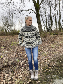 Slik finner du riktig størrelse : Ta mål av et plagg du allerede har, som passer. Sammenlign målene med oppskriften. Velg størrelse ut i fra overvidden på bolen . Lengde på både bol og ermer kan du selvsagt strikke lenger eller kortere ved behov, bare husk å bestill ekstra garn om du vil legge til noe på lengden!