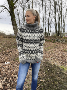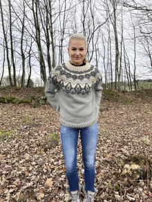 Slik finner du riktig størrelse : Ta mål av et plagg du allerede har, som passer. Sammenlign målene med oppskriften. Velg størrelse ut i fra overvidden på bolen . Lengde på både bol og ermer kan du selvsagt strikke lenger eller kortere ved behov, bare husk å bestill ekstra garn om du vil legge til noe på lengden!