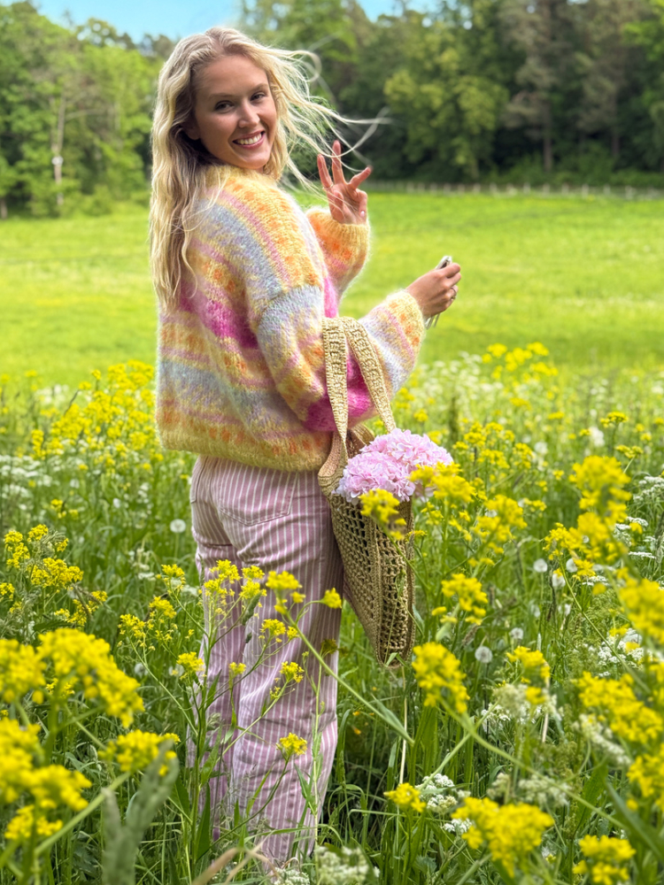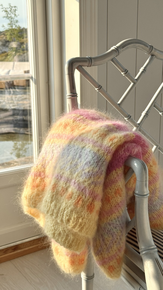 Du kan selv endre farge i strikkepakken ; velg da først størrelsen du ønsker å strikke, så kommer det opp fargevalg nedenfor. NB! Oppskrift vil alltid leveres i strikkepakkens originale farger:Lavendel, Gul, Dyp Rød, Oransje, Pæregrønn og Honningmelon