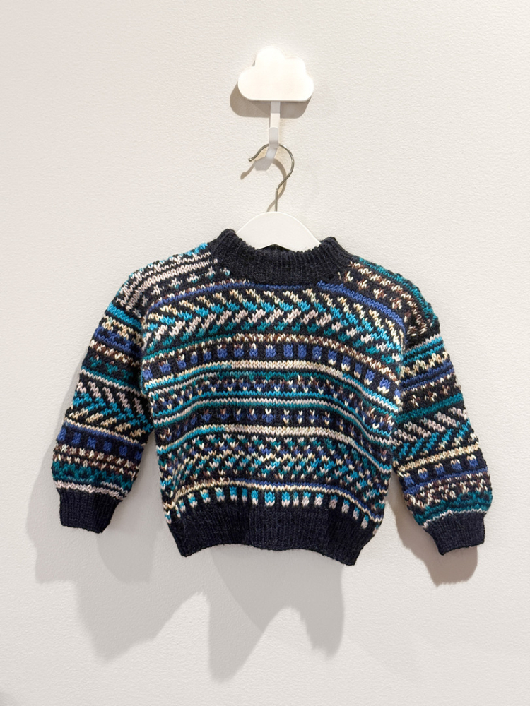 Du kan selv endre farge i strikkepakken ; velg da først størrelsen du ønsker å strikke, så kommer det opp fargevalg nedenfor. NB! Oppskrift vil alltid leveres i strikkepakkens originale farger: Mørk Indigo og Aqua/Blålilla Print