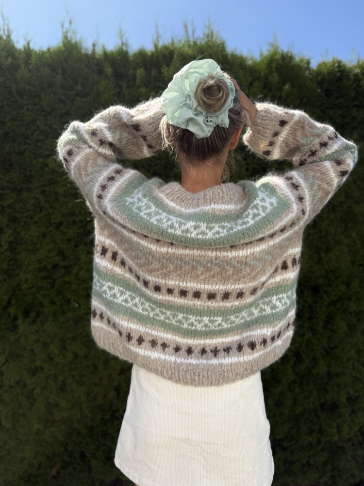 Du kan selv endre farge i strikkepakken ; velg da først størrelsen du ønsker å strikke, så kommer det opp fargevalg nedenfor. NB! Oppskrift vil alltid leveres i strikkepakkens originale farger: Sand Melange, White, Camel, Pistachio, Espresso og Jade Green.