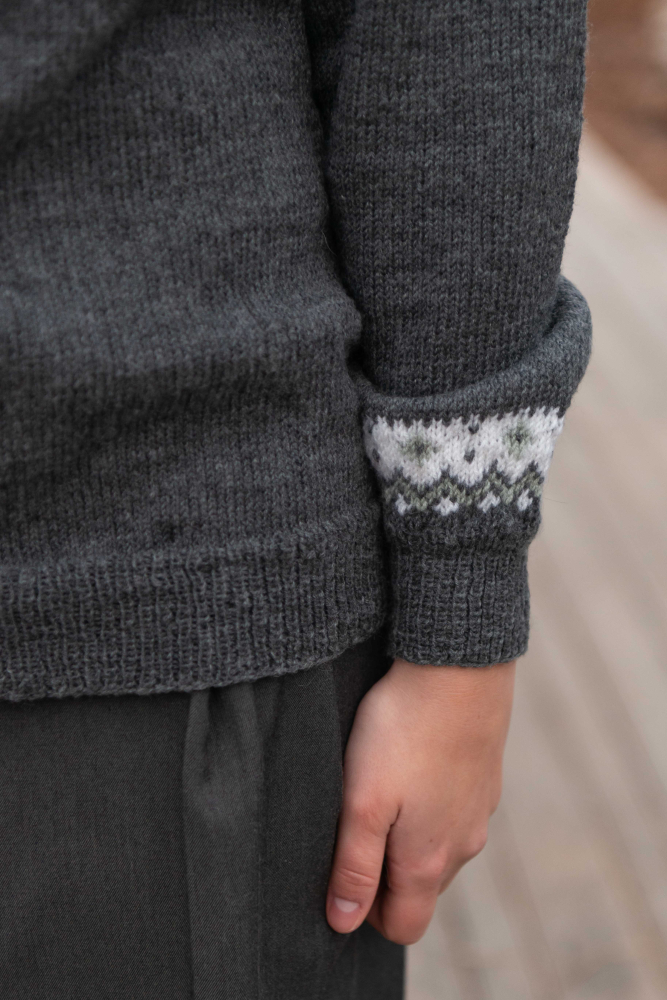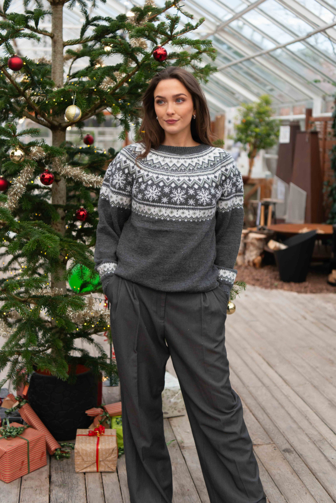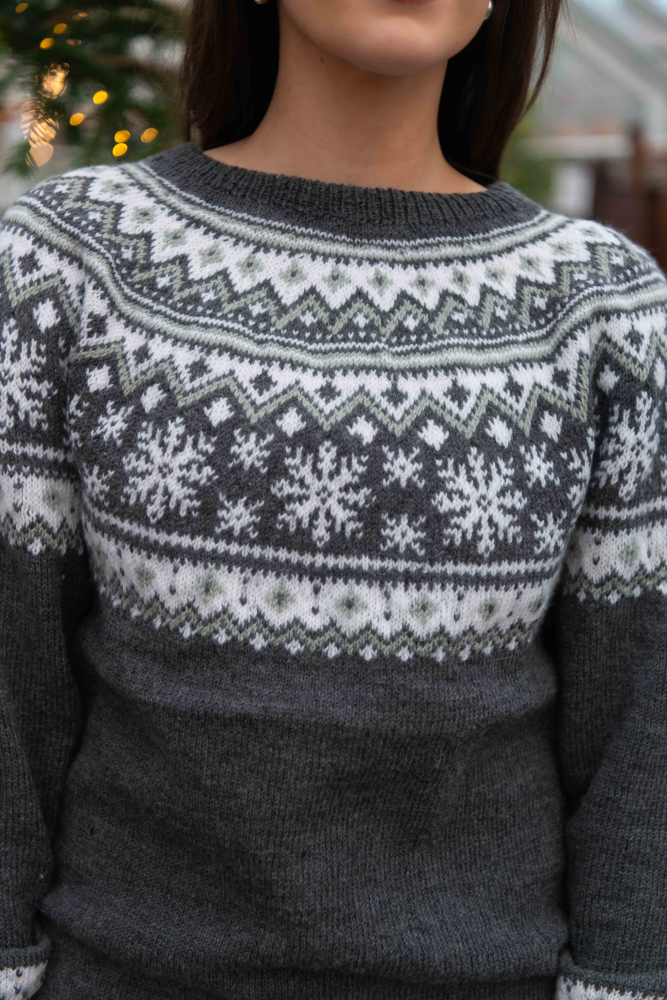 Du kan selv endre farge i strikkepakken ; velg da først størrelsen du ønsker å strikke, så kommer det opp fargevalg nedenfor. NB! Oppskrift vil alltid leveres i strikkepakkens originale farger: Koksgrå Melert, Hvit og Mineralgrå