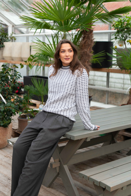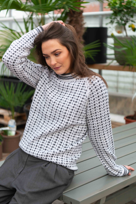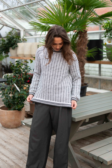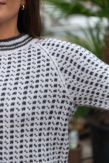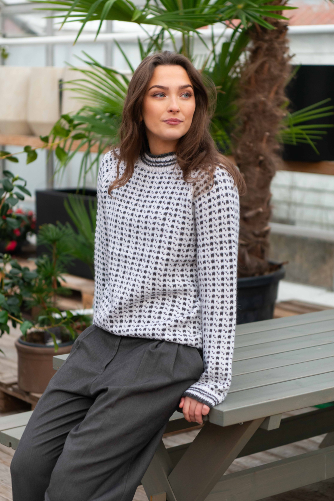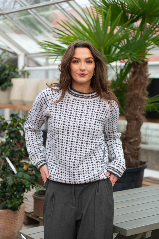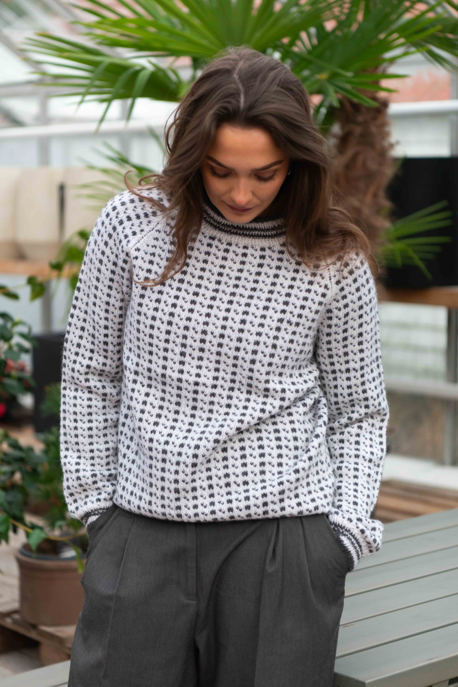 Du kan selv endre farge i strikkepakken ; velg da først størrelsen du ønsker å strikke, så kommer det opp fargevalg nedenfor. NB! Oppskrift vil alltid leveres i strikkepakkens originale farge: Hvit og Koksgrå