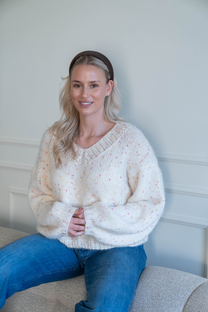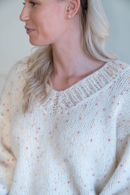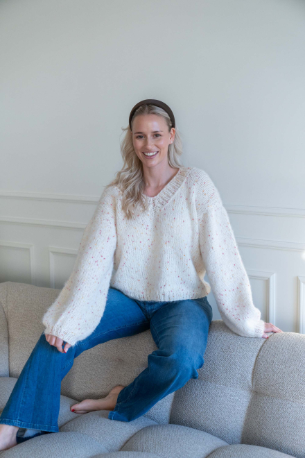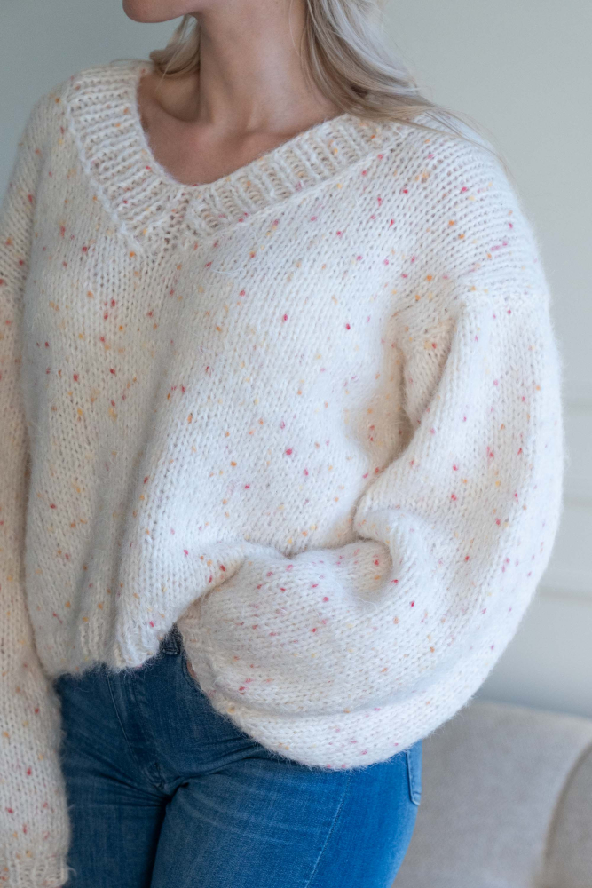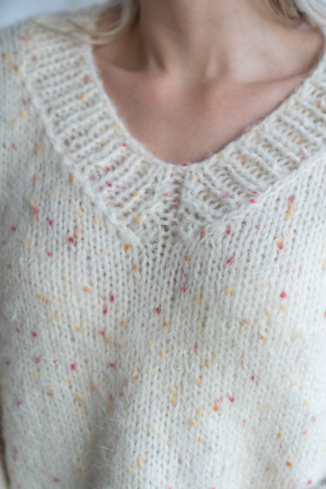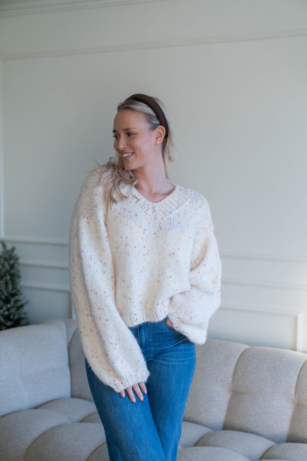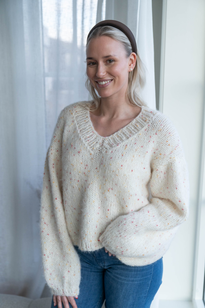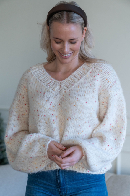 Oversized, kort, trendy V-genser, strikket i dobbelt garn, isydde ermer uten maskinsømmer.