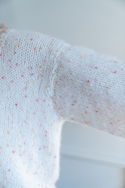 Du kan selv endre farge i strikkepakken ; velg da først størrelsen du ønsker å strikke, så kommer det opp fargevalg nedenfor. NB! Oppskrift vil alltid leveres i strikkepakkens originale farger: Hvit og Blush