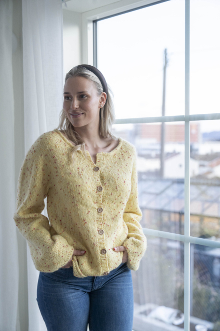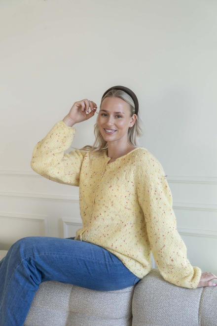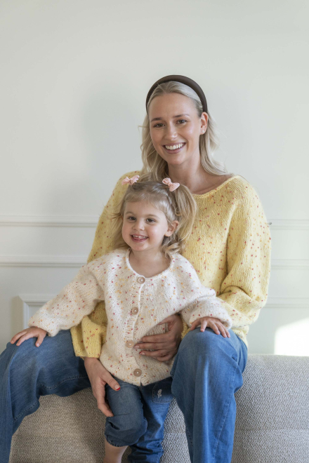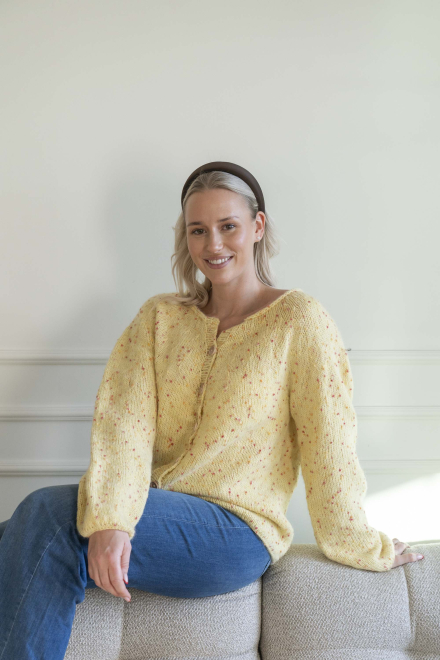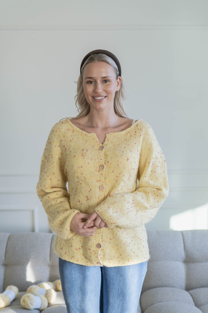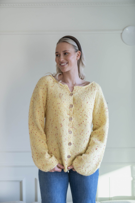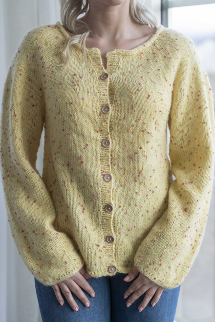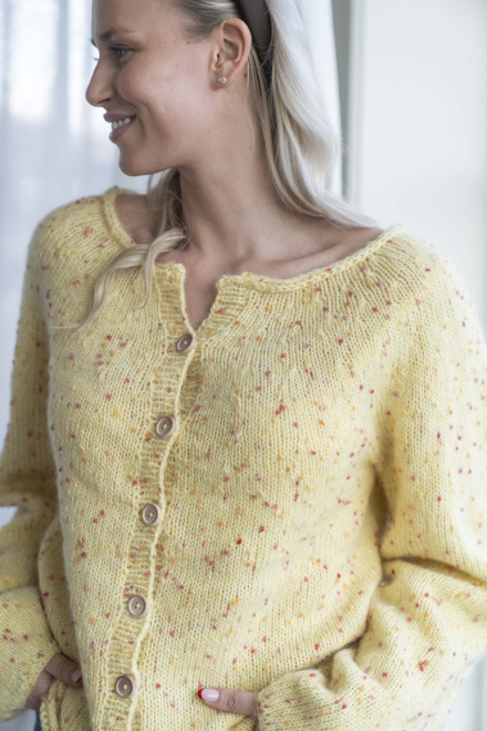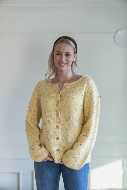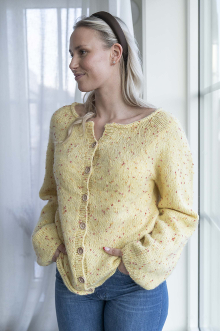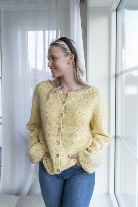 Du kan selv endre farge i strikkepakken ; velg da først størrelsen du ønsker å strikke, så kommer det opp fargevalg nedenfor. NB! Oppskrift vil alltid leveres i strikkepakkens originale farger: Smørblomst