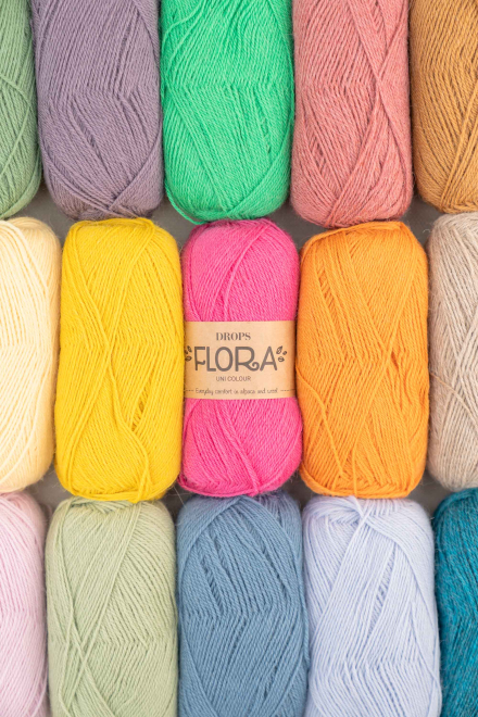 10 nøster Drops Flora, med tilfeldig sammensatte farger og partinummer. Kanskje alle er like, kanskje alle er forskjellige. Tør du ta sjansen og se hva som venter i din lykkepose?