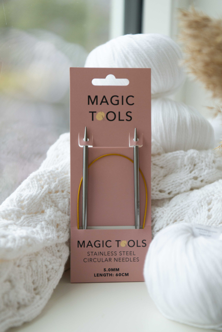 Lette rundpinner i stål med spisset tupp slik at garnet glir lett på pinnene.