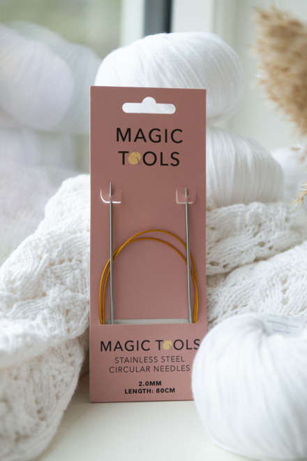 Lette rundpinner i stål med spisset tupp slik at garnet glir lett på pinnene.