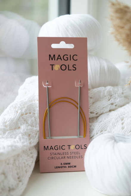 Lette rundpinner i stål med spisset tupp slik at garnet glir lett på pinnene.
