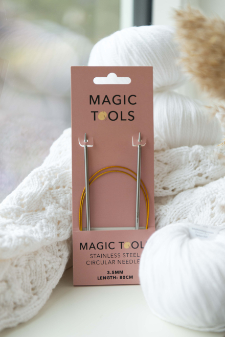 Lette rundpinner i stål med spisset tupp slik at garnet glir lett på pinnene.