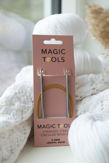 Lette rundpinner i stål med spisset tupp slik at garnet glir lett på pinnene.