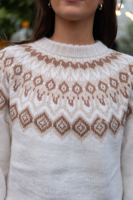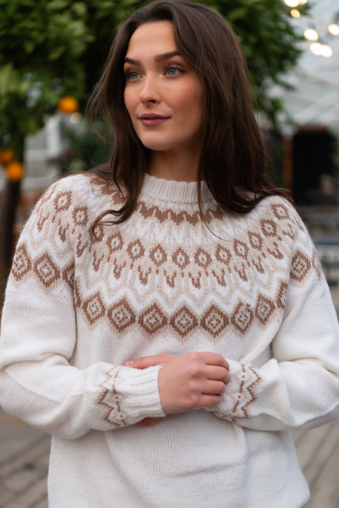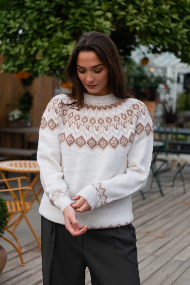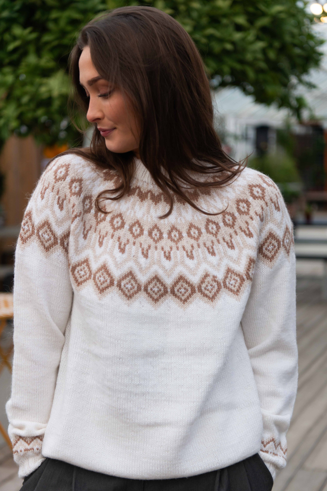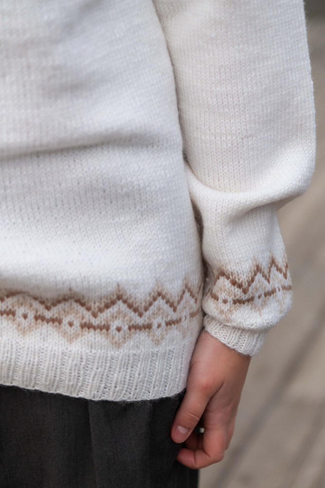 Du kan selv endre farge i strikkepakken ; velg da først størrelsen du ønsker å strikke, så kommer det opp fargevalg nedenfor. NB! Oppskrift vil alltid leveres i strikkepakkens originale farger: Offwhite, Lys Beige Melert og Mocca Mousse