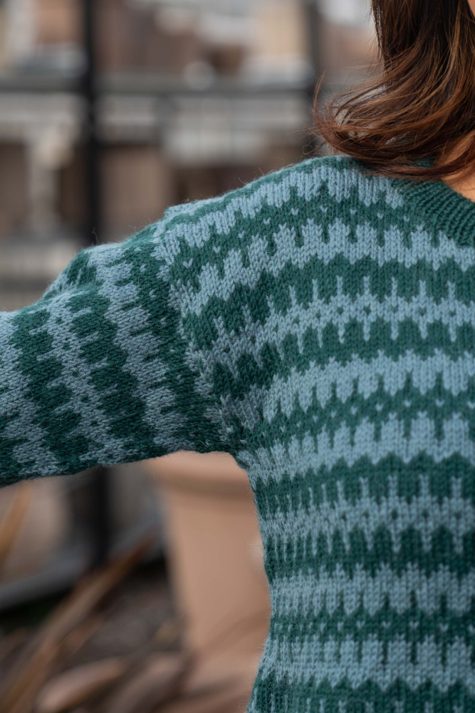 Rett, vrang, mønsterstrikk, montering med symaskin. / Plagget strikkes rundt nedenfra og , og klippes opp i sidene til ermehull. Ermene strikkes for seg og sys i for hånd / Vanskelighetsgrad;  Øvet