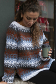Du kan selv endre farge i strikkepakken ; velg da først størrelsen du ønsker å strikke, så kommer det opp fargevalg nedenfor. NB! Oppskrift vil alltid leveres i strikkepakkens originale farger: Hvit, Mørk Brun, Brent Kobber og Grønn