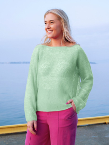 Slik finner du riktig størrelse : Ta mål av et plagg du allerede har, som passer. Sammenlign målene med oppskriften. Velg størrelse ut i fra overvidden på bolen . Lengde på både bol og ermer kan du selvsagt strikke lenger eller kortere ved behov, bare husk å bestill ekstra garn om du vil legge til noe på lengden!