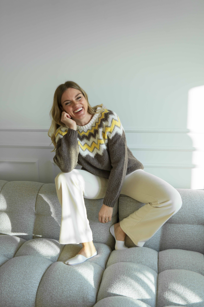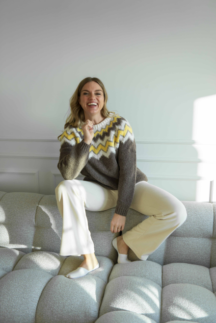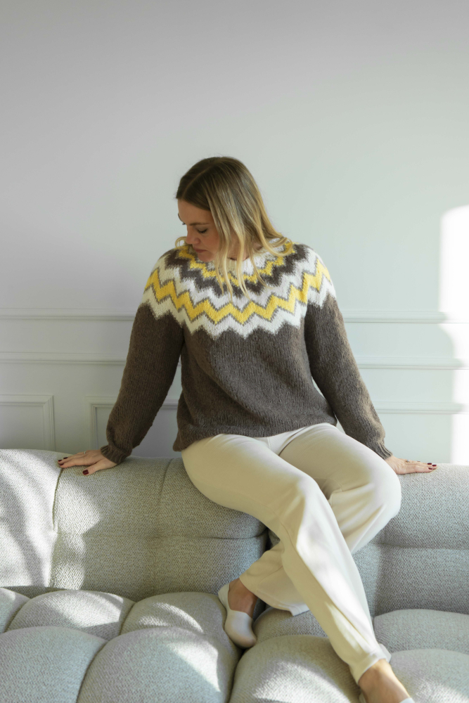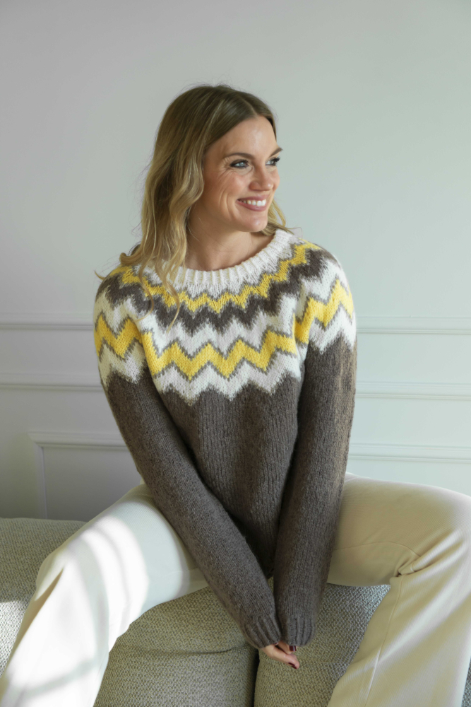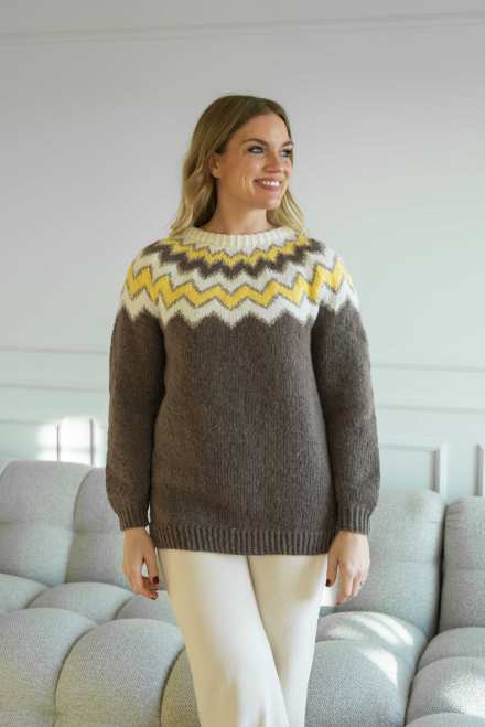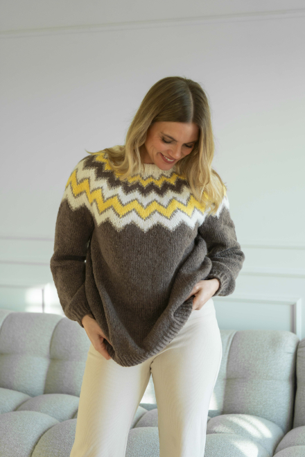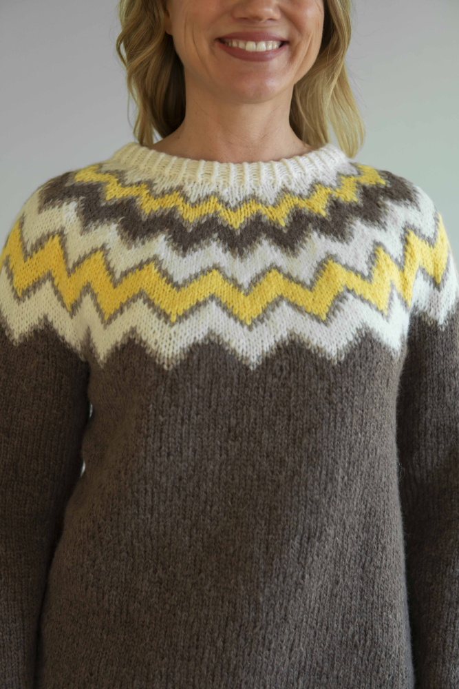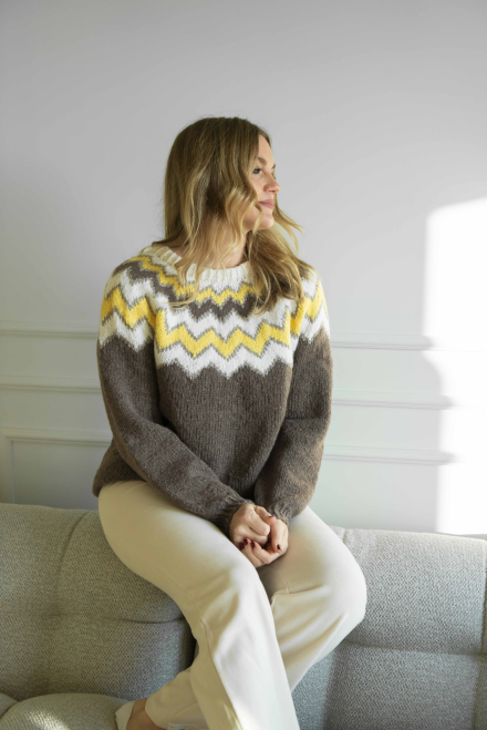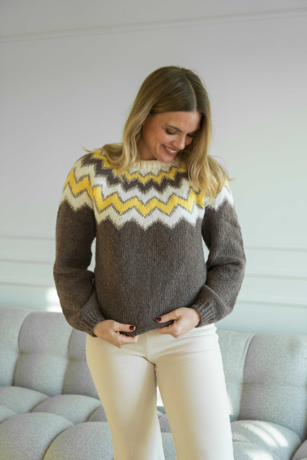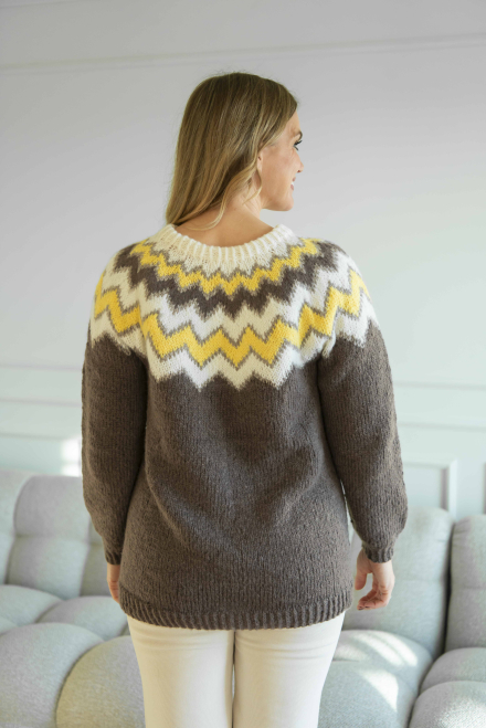 Du kan selv endre farge i strikkepakken ; velg da først størrelsen du ønsker å strikke, så kommer det opp fargevalg nedenfor. NB! Oppskrift vil alltid leveres i strikkepakkens originale farger: Mellombrun, Beige, Hvit og Lys Gul
