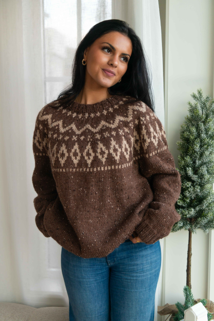 Du kan selv endre farge i strikkepakken ; velg da først størrelsen du ønsker å strikke, så kommer det opp fargevalg nedenfor. NB! Oppskrift vil alltid leveres i strikkepakkens originale farger: Brun og Lys Beige