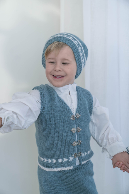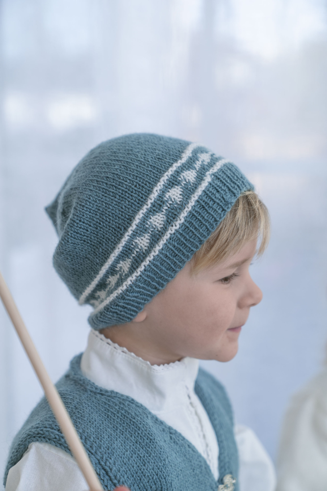 Du kan selv endre farge i strikkepakken ; velg da først størrelsen du ønsker å strikke, så kommer det opp fargevalg nedenfor. NB! Oppskrift vil alltid leveres i strikkepakkens originale farger: Lys Sjøgrønn og Hvit