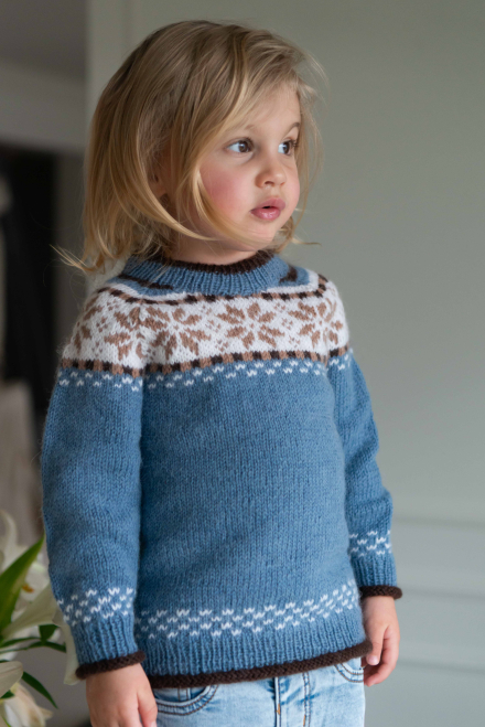 Du kan selv endre farge i strikkepakken ; velg da først størrelsen du ønsker å strikke, så kommer det opp fargevalg nedenfor. NB! Oppskrift vil alltid leveres i strikkepakkens originale farge: Denim, Hvit, Mokka Mousse og Mørk Brun