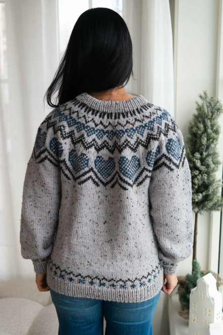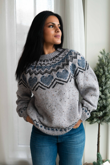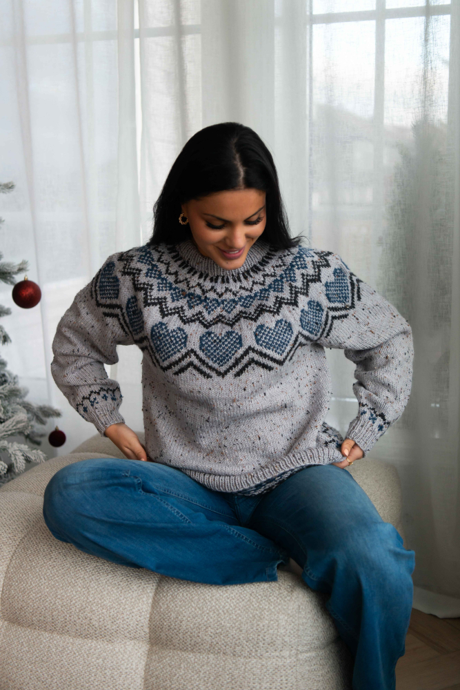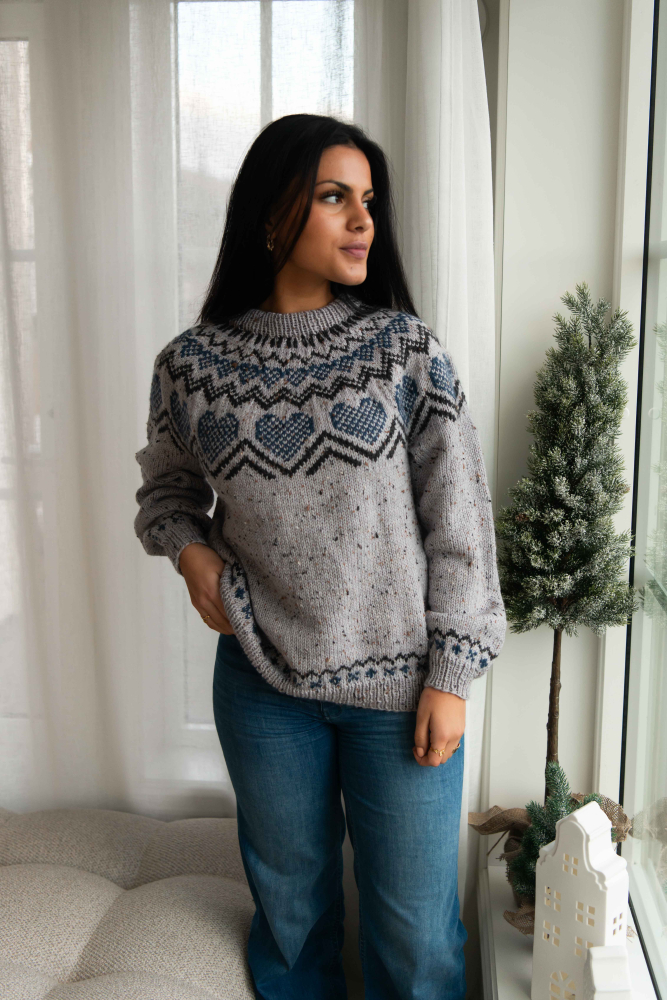 Du kan selv endre farge i strikkepakken ; velg da først størrelsen du ønsker å strikke, så kommer det opp fargevalg nedenfor. NB! Oppskrift vil alltid leveres i strikkepakkens originale farger: Lys Grå, Indigo og Koksgrå
