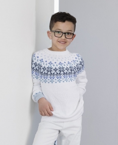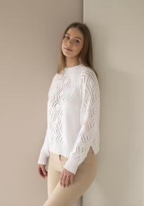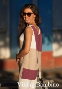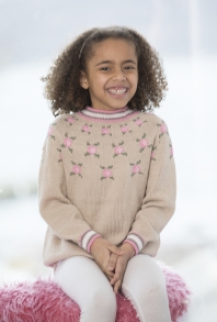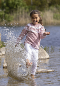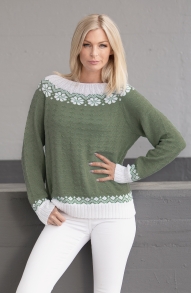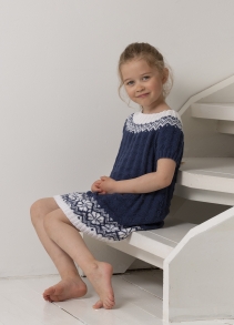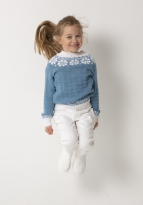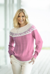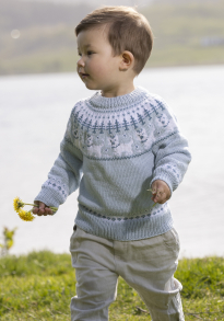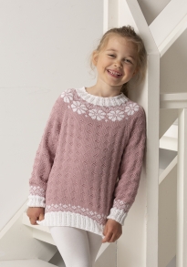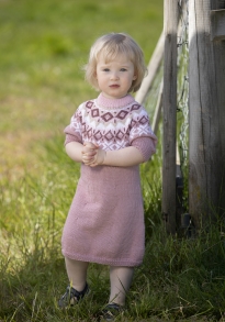 Glattstrikk, rett, vrang, mønster med flere farger. Plagget strikkes rundt nedenfra og opp, og har raglansfelling på bærestykket. Vanskelighetsgrad; Lett Øvet