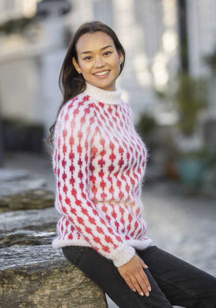 Du kan selv endre farge i strikkepakken ; velg da først størrelsen du ønsker å strikke, så kommer det opp fargevalg nedenfor. NB! Oppskrift vil alltid leveres i strikkepakkens originale farge: Hvit og Multi Rød