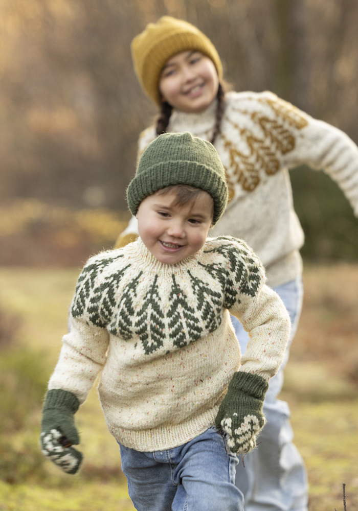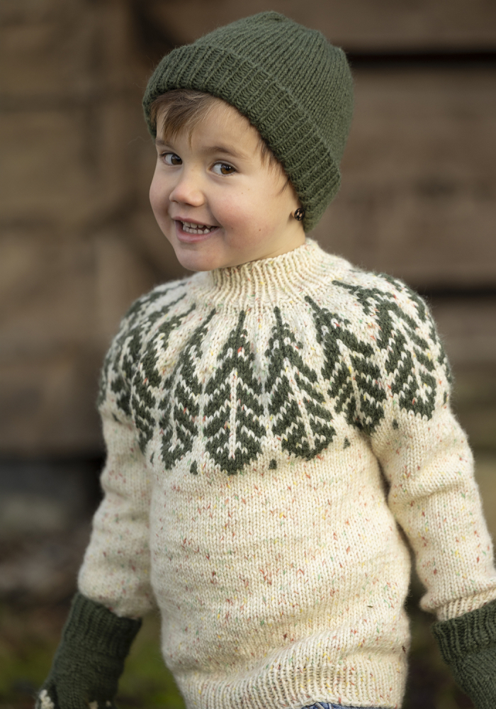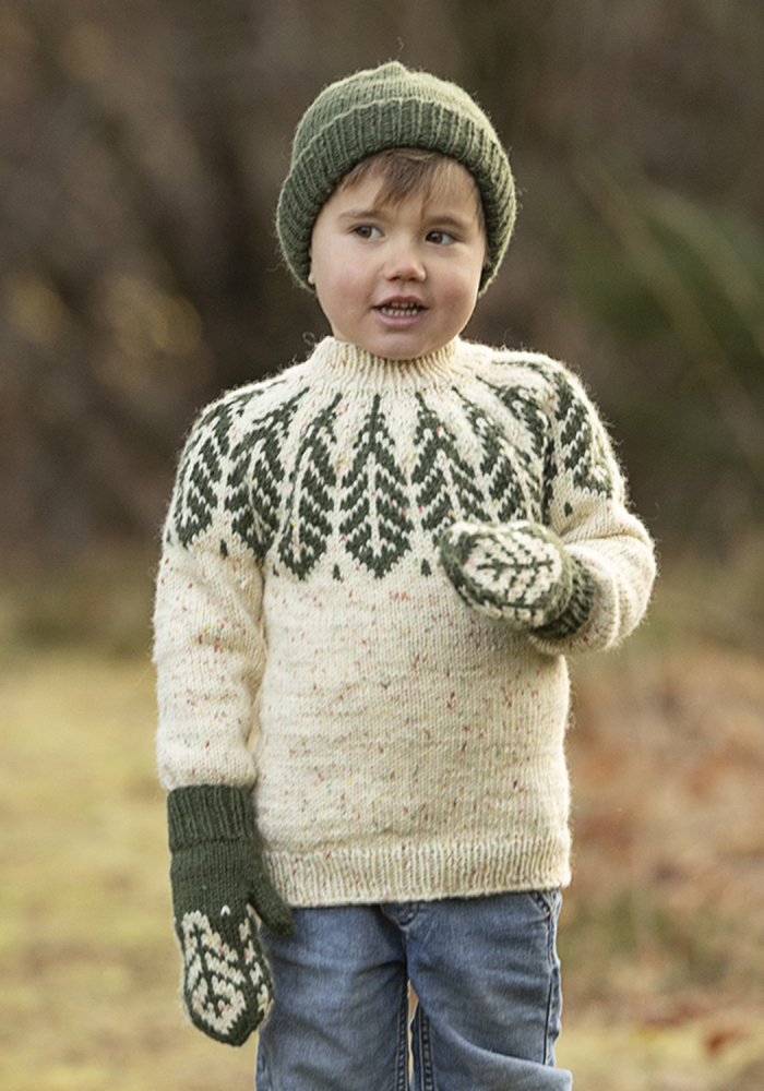 Du kan selv endre farge i strikkepakken ; velg da først størrelsen du ønsker å strikke, så kommer det opp fargevalg nedenfor. NB! Oppskrift vil alltid leveres i strikkepakkens originale farger: Tuttifrutti Print og Mørk Grønn