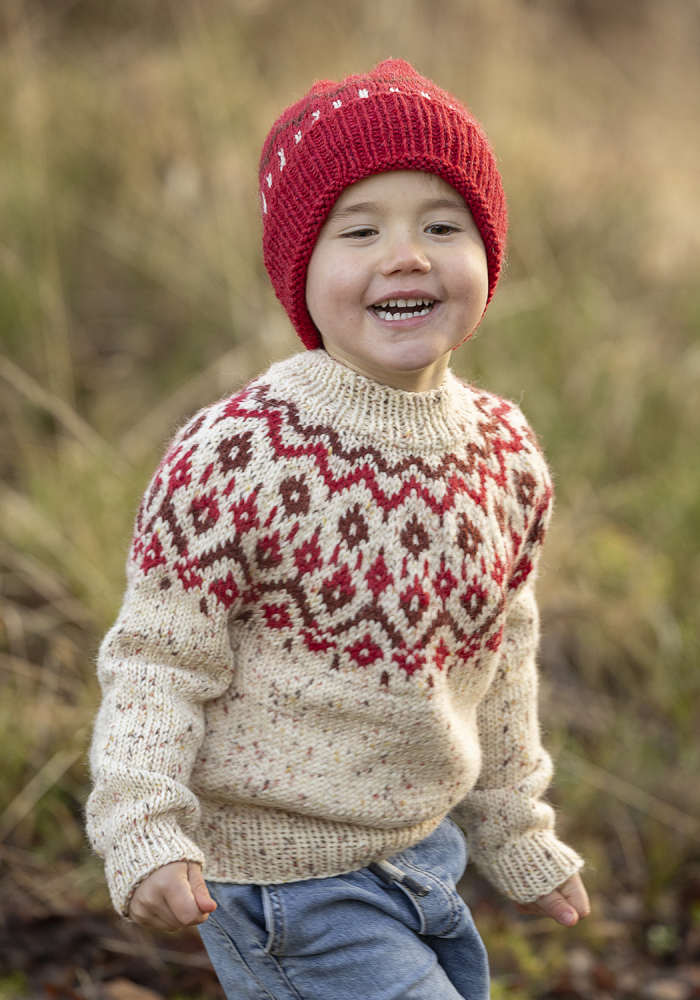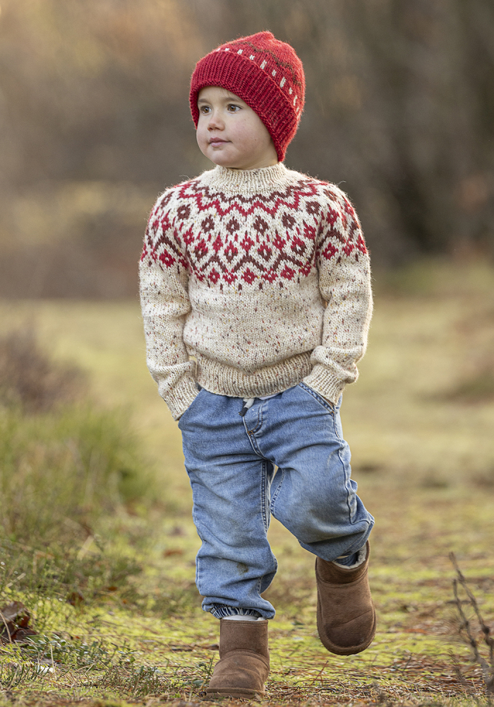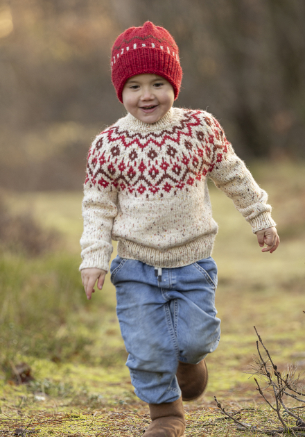 Du kan selv endre farge i strikkepakken ; velg da først størrelsen du ønsker å strikke, så kommer det opp fargevalg nedenfor. NB! Oppskrift vil alltid leveres i strikkepakkens originale farger: Rød Print, Roserød og Rød