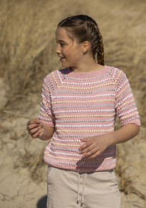 Glattstrikk, rett, vrang, i-cord. / Plagget strikkes rundt nedenfra og opp, og deles ved ermehullene for så å strikkes frem og tilbake. / Vanskelighetsgrad; Lett