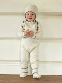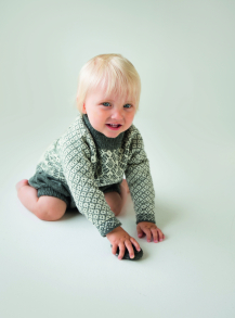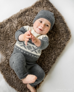 Rett, vrang, mønster med flere farger / Buksen strikkes rundt ovenfra og ned.. Jakken strikkes rundt  nedenfra og opp, og klippes opp i front og til ermehull. Ermene strikkes for seg og sys i for hånd. / Vanskelighetsgrad;  Lett Øvet